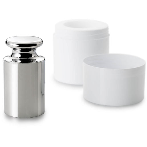 Single E2 OIML class knob weight in a plastic box including a calibration certificate